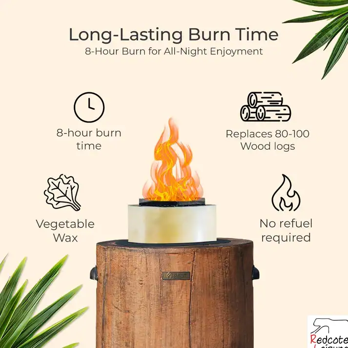 - Burns steadily for up to 8 hours on a single vegetable‑wax refill.