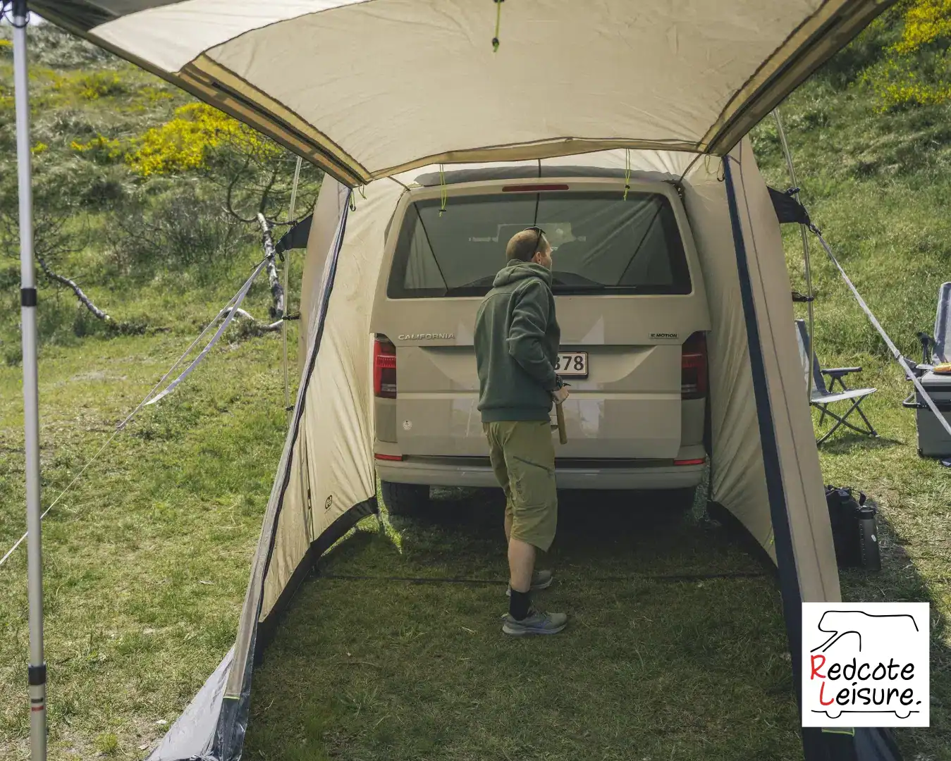 A universal fit awning for Micro Campers with a rear tailgate.