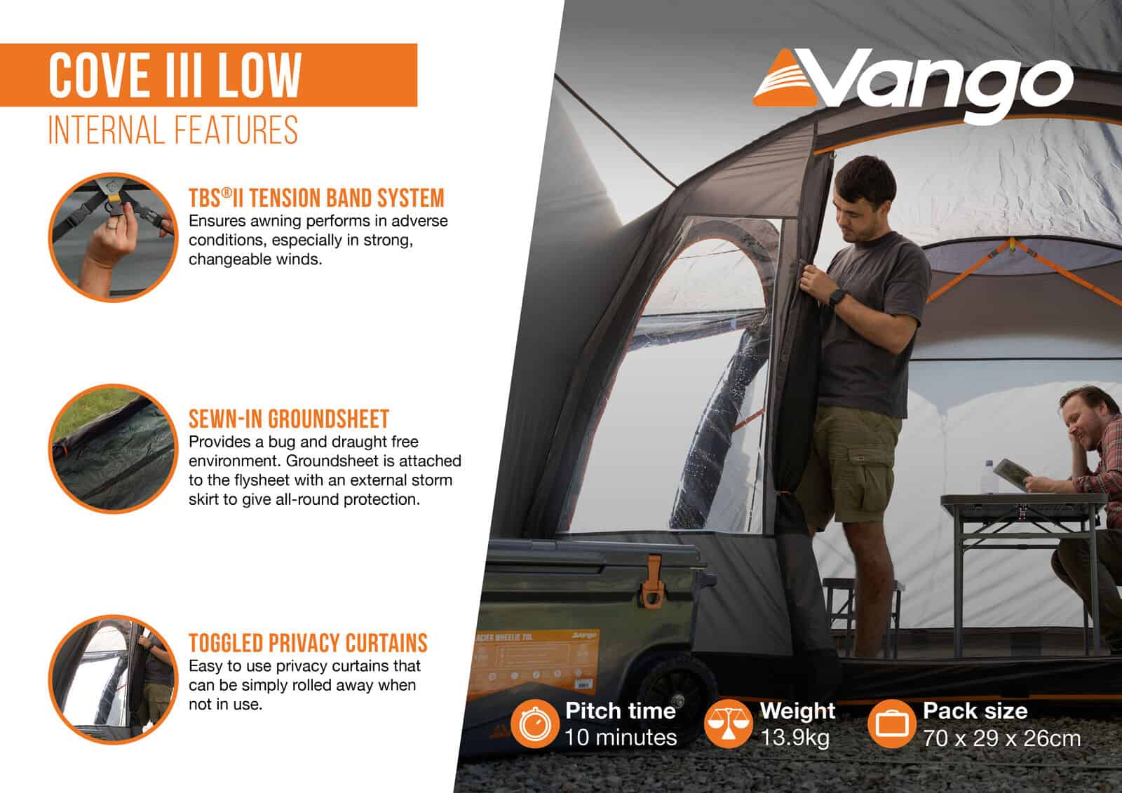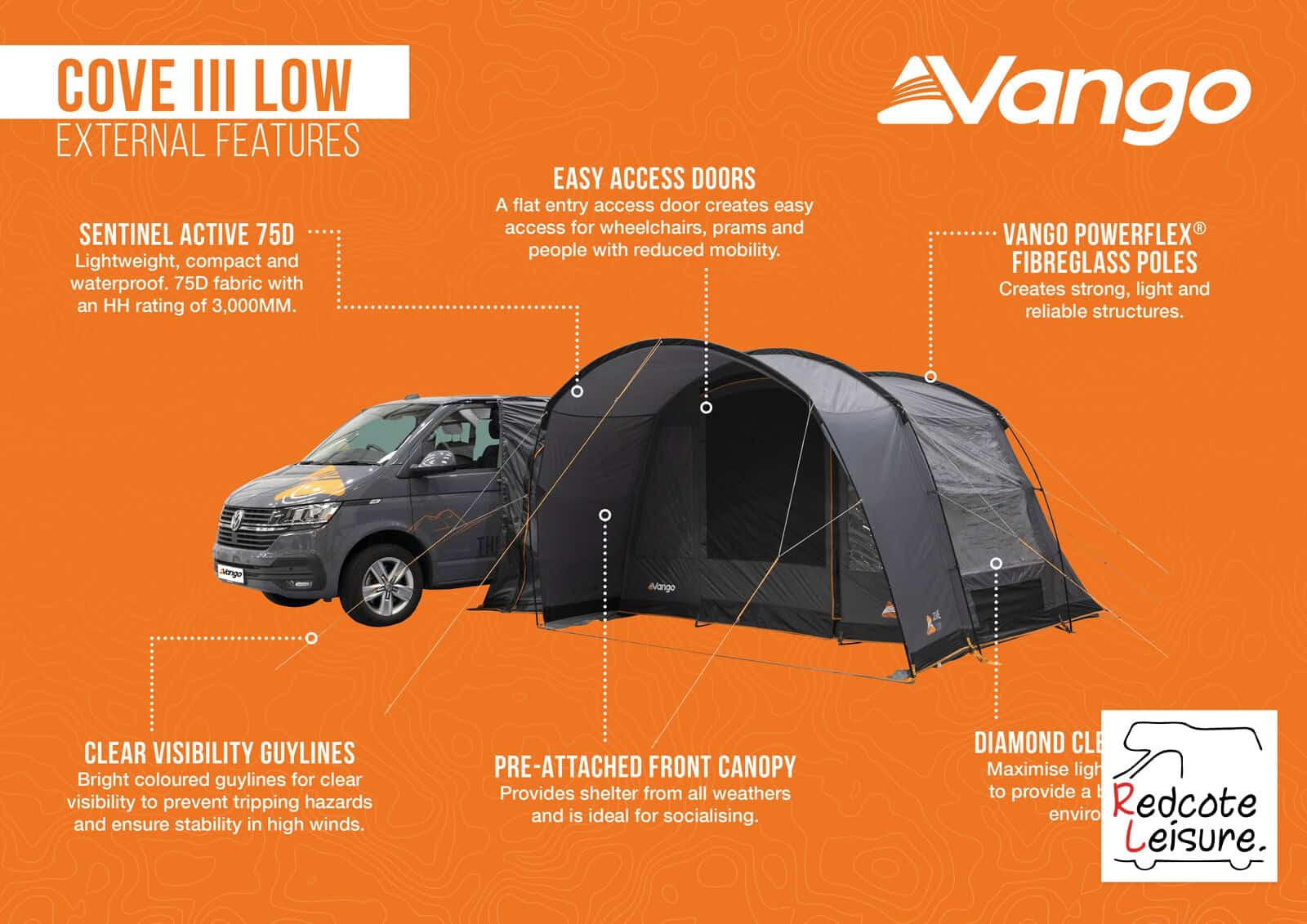 • Pegging Assistance – Key pegging points are highlighted in orange. Pitch these points first to create the correct shape of your awning. Thereafter errect your tent.