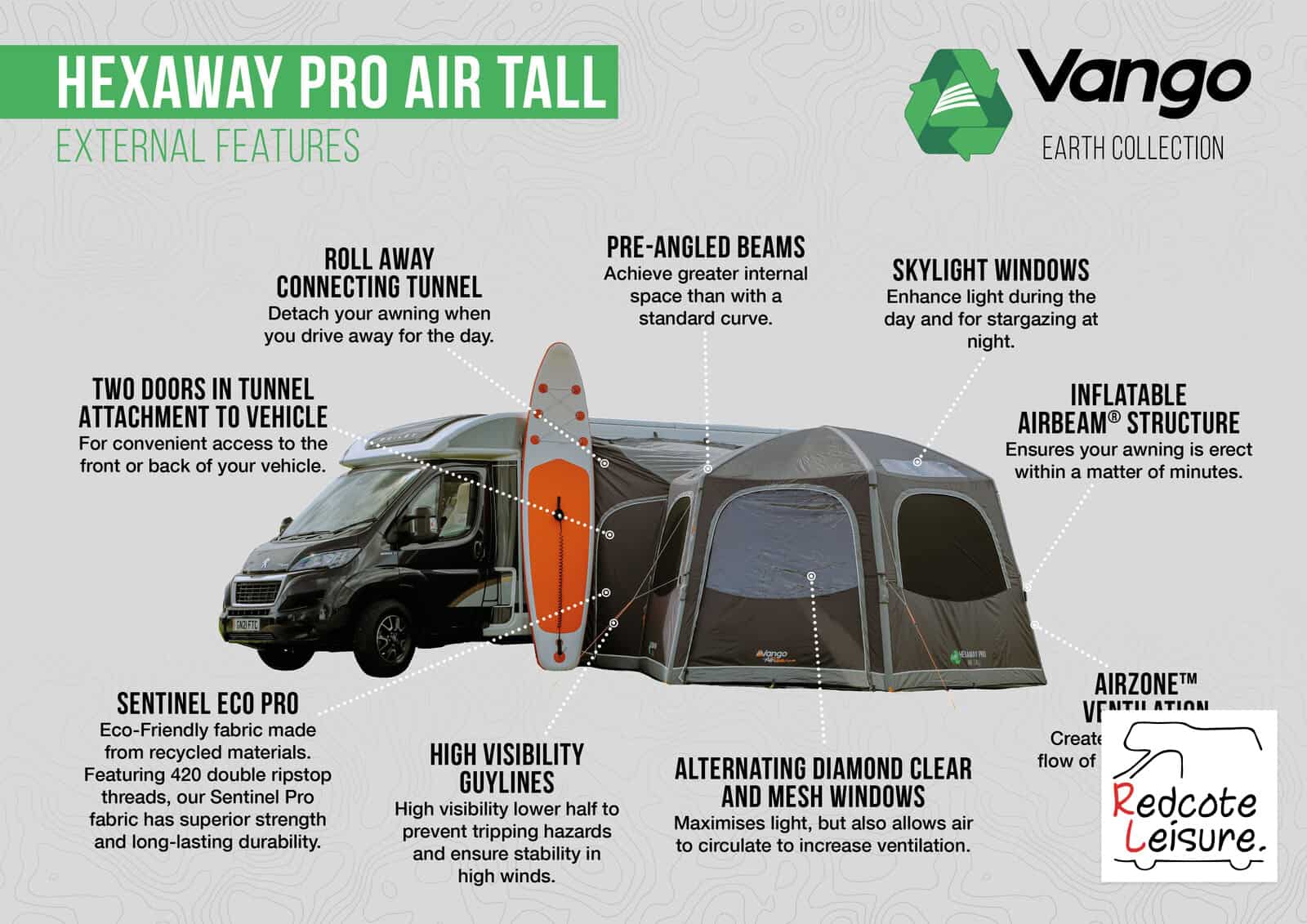 • Inflatable AirBeam Structure – With 10 years’ experience in AirBeam technology, we are the leaders in pole free pitching. AirBeam technology ensures your awning is erect within a matter of minutes (supplied with AirBeam pump)