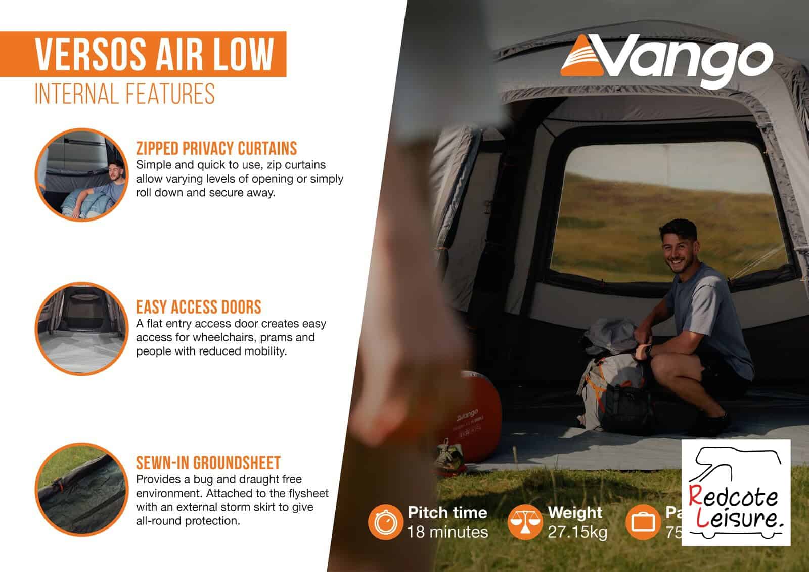 The Vango Versos Air Low is adaptable for every adventure. A versatile design allows you to rearrange the bedroom and annexe, so you can decide whether your awning is front or side facing. Utilising Vango’s AirBeam® technology and Sentinel Active 150D fabric, it is quick and easy to pitch while being light, durable and waterproof.