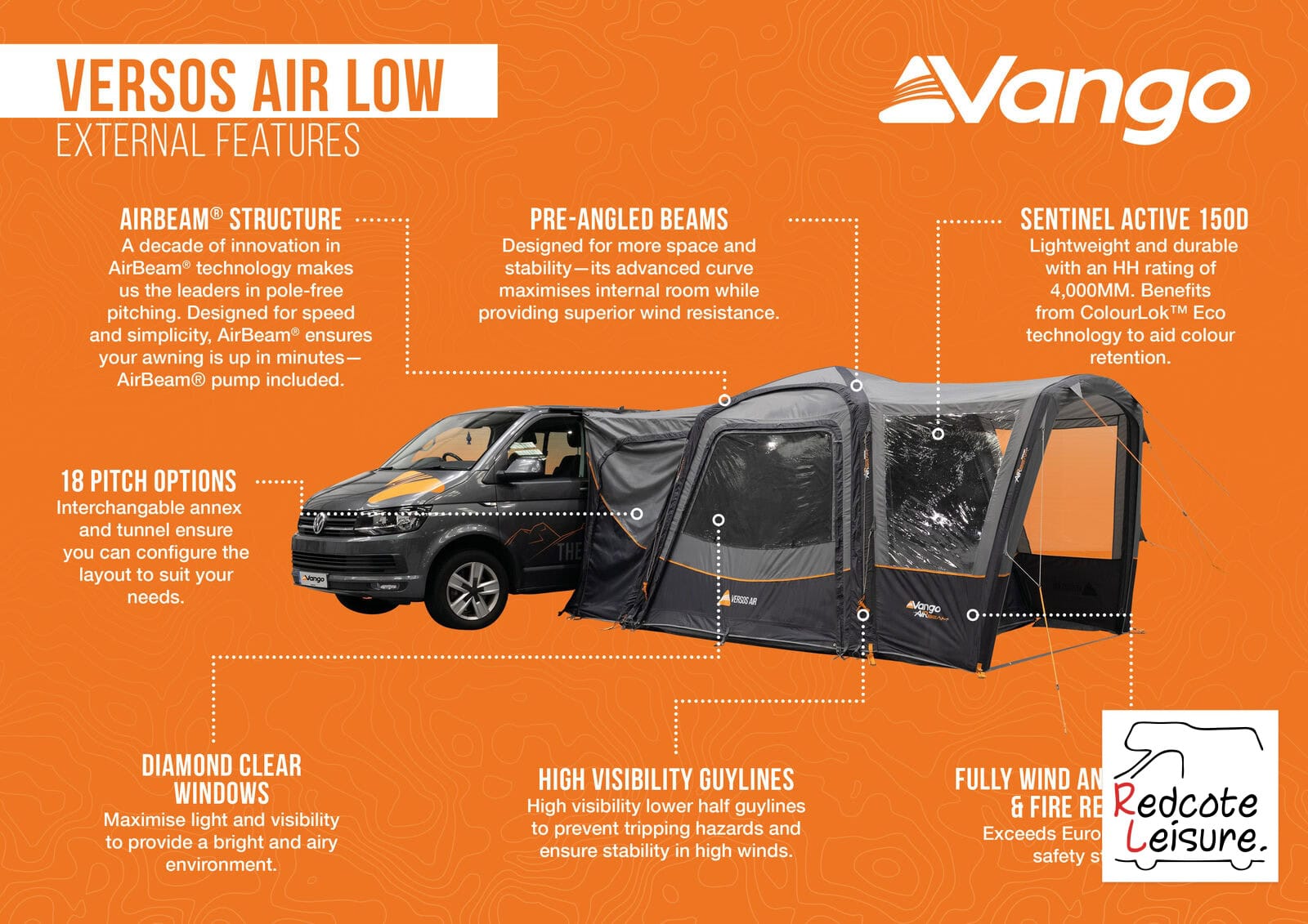 • Inflatable AirBeam Structure – With 10 years’ experience in AirBeam technology, we are the leaders in pole-free pitching. AirBeam technology ensures your awning is erect within a matter of minutes (supplied with AirBeam pump)